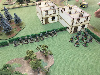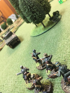 9.10 am – La sección del Scharfürher Roth recibe órdenes de avanzar por el flanco izquierdo alemán y se posicionan tras los setos antes de las casas dominando el centro del campo de batalla.